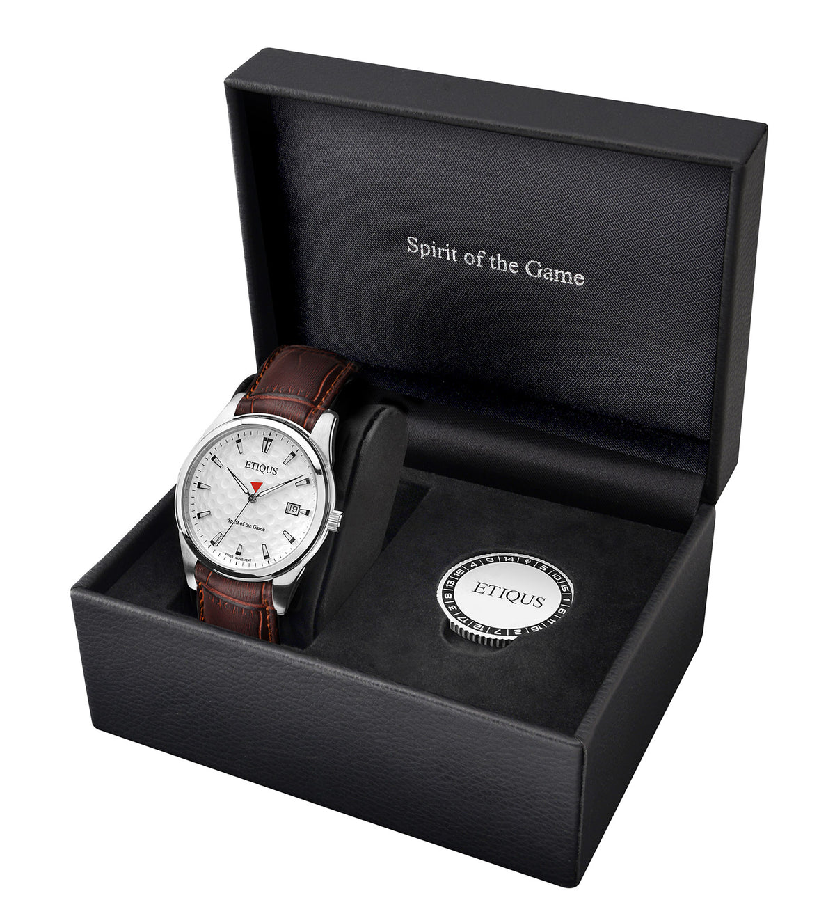 Men’s timepiece featuring a high-grade stainless steel case with sapphire crystal glass and genuine leather strap. Dimpled dial with applied luminous inlaid hour markers. Swiss Quartz big date movement. Presented in attractive gift box.