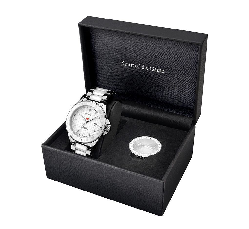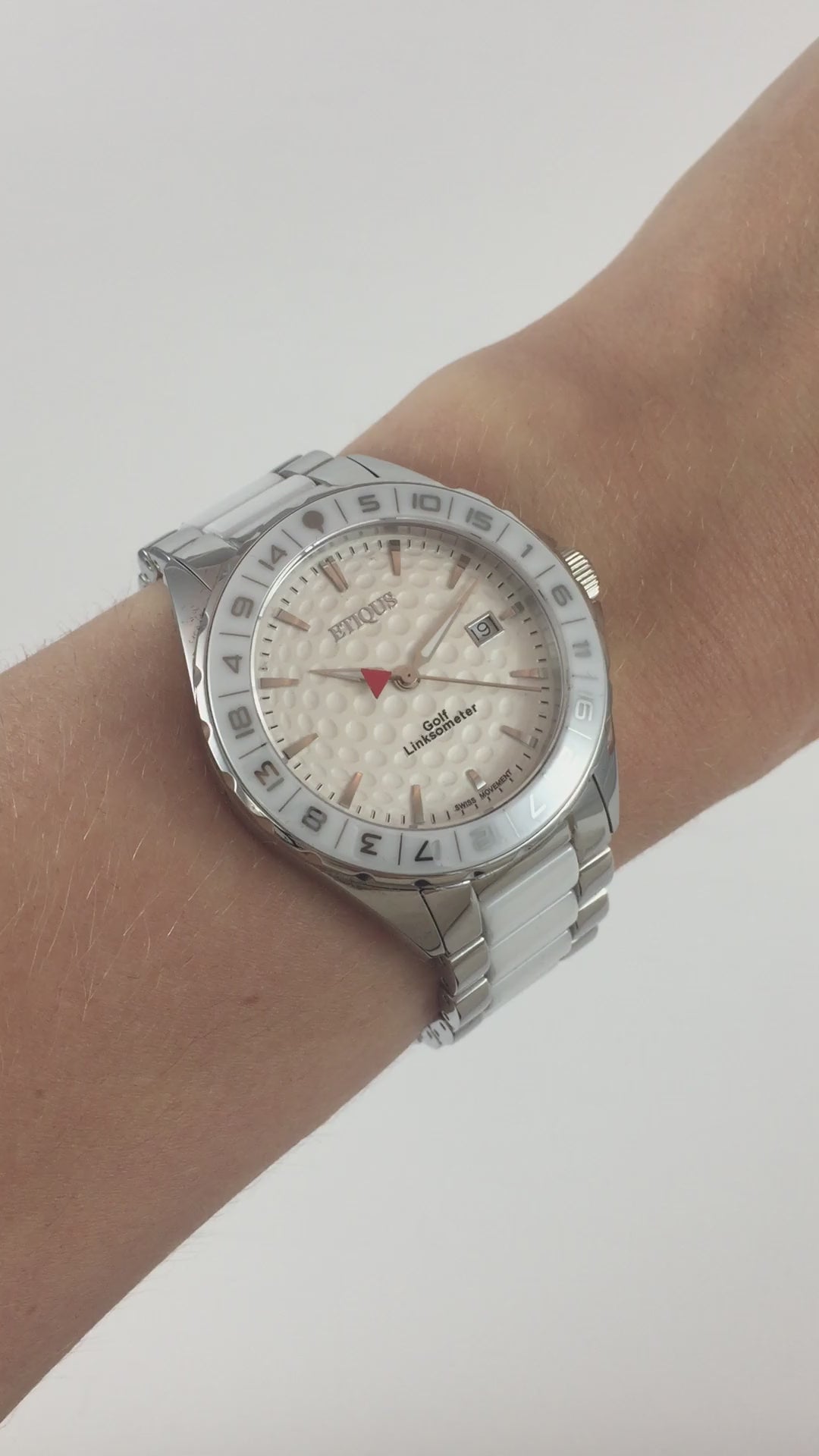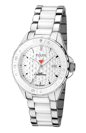 Patented Ladies ETIQUS Timepiece featuring a high grade stainless steel case with sapphire crystal glass and stainless steel bracelet with white ceramic centre links. Dimpled dial with applied luminous inlaid hour markers. Swiss Quartz big date movement and a rotating unidirectional bezel with Golf Linksometer markings. Presented with a stainless steel ball marker in a gift box.