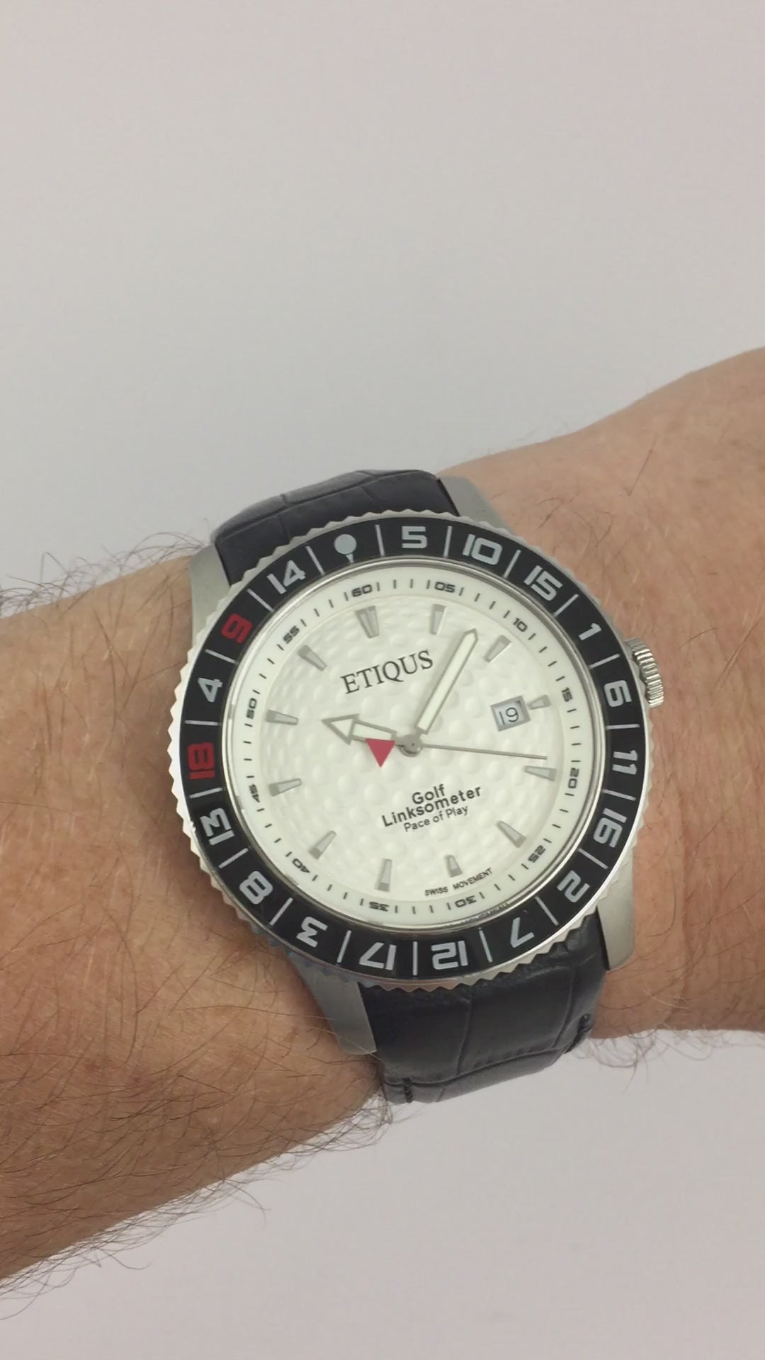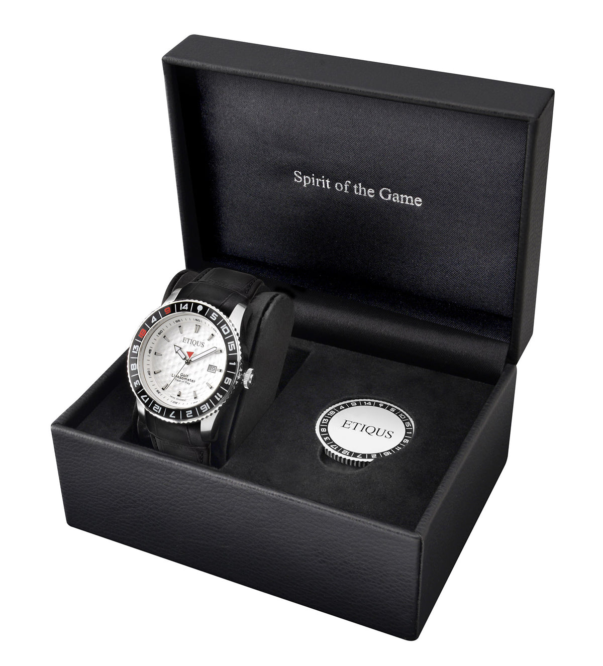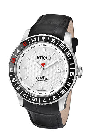 Patented Golf timepiece featuring high grade stainless steel case with sapphire crystal glass and genuine leather strap in croc effect finish. Dimpled dial with applied luminous inlaid hour markers. Swiss Quartz big date movement and rotating unidirectional bezel with Golf Linksometer markings. Presented in attractive gift box.