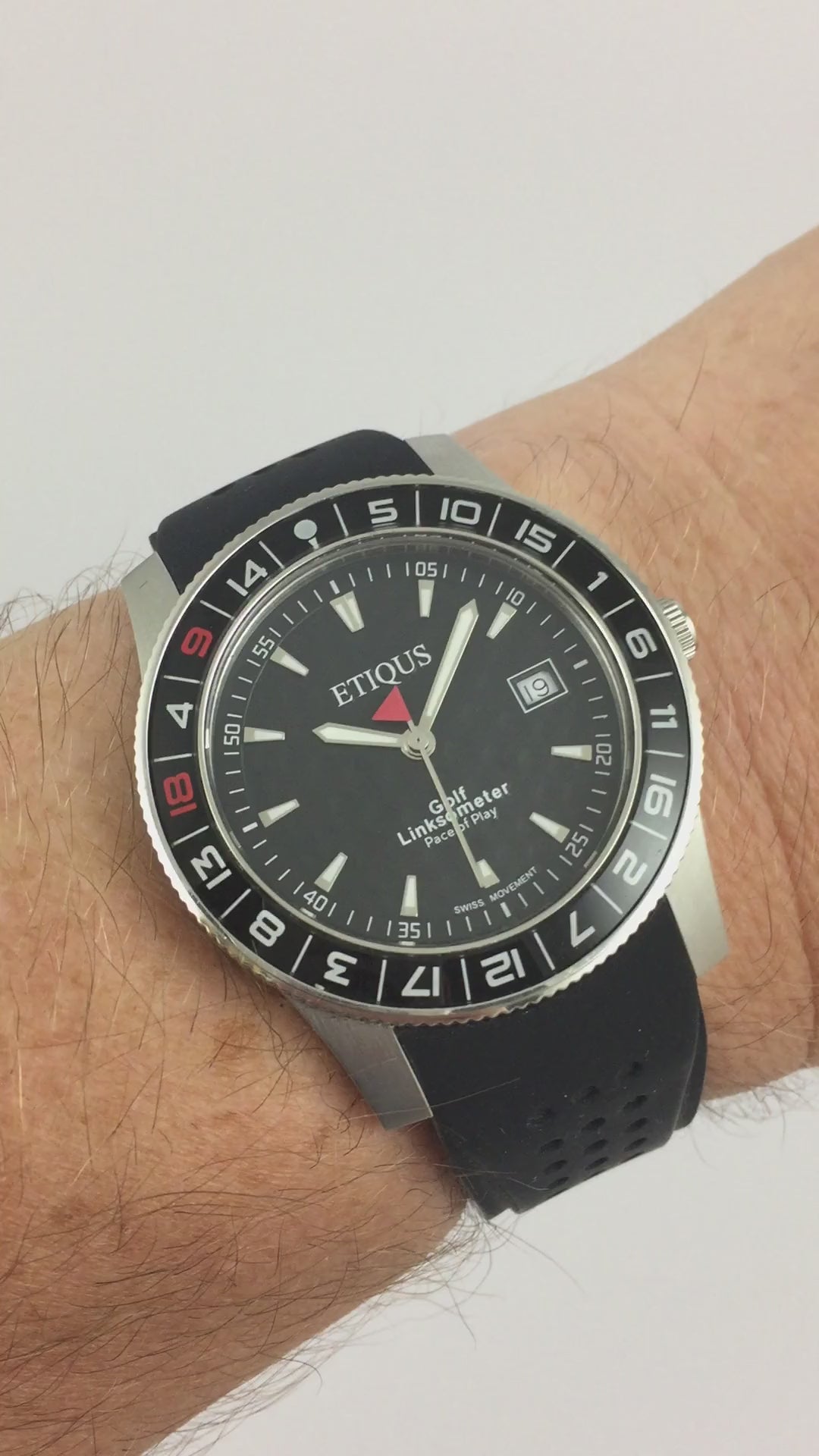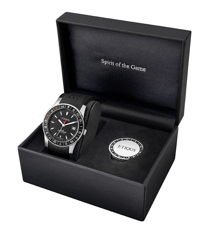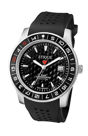 Patented Golf timepiece featuring high grade stainless steel case with sapphire crystal glass and black durable silicone strap. Dimpled dial with applied luminous inlaid hour markers. Swiss Quartz big date movement and rotating unidirectional bezel with Golf Linksometer markings. Presented in attractive gift box.