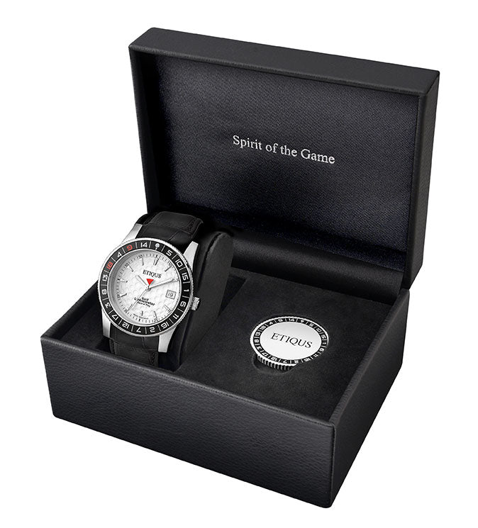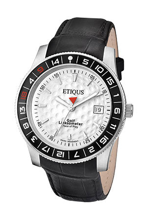 Patented Golf timepiece featuring high grade stainless steel case with sapphire crystal glass and black croc textured leather strap. 3D Golf Ball effect dial with applied luminous inlaid hour markers. Swiss Quartz big date movement and rotating ratchet bezel with Golf Linksometer markings. Presented in attractive gift box.