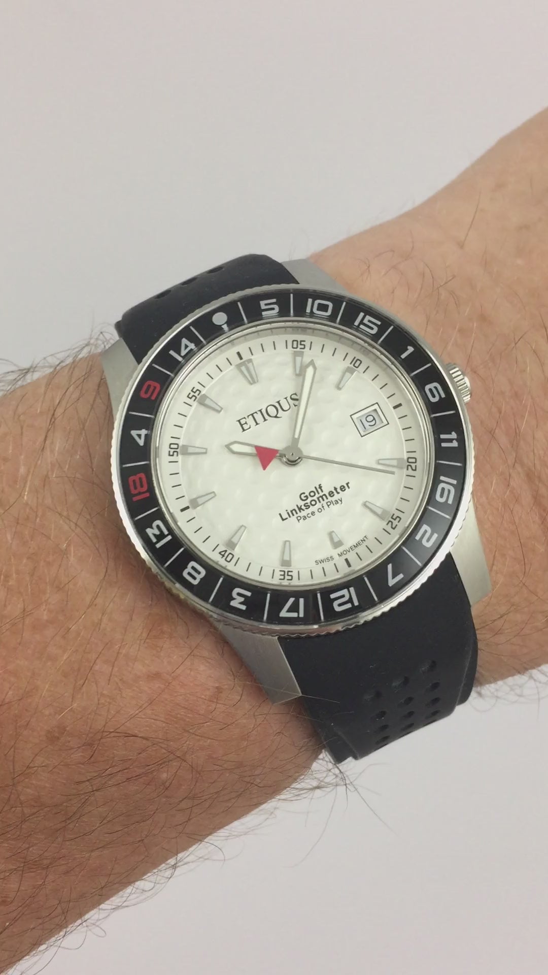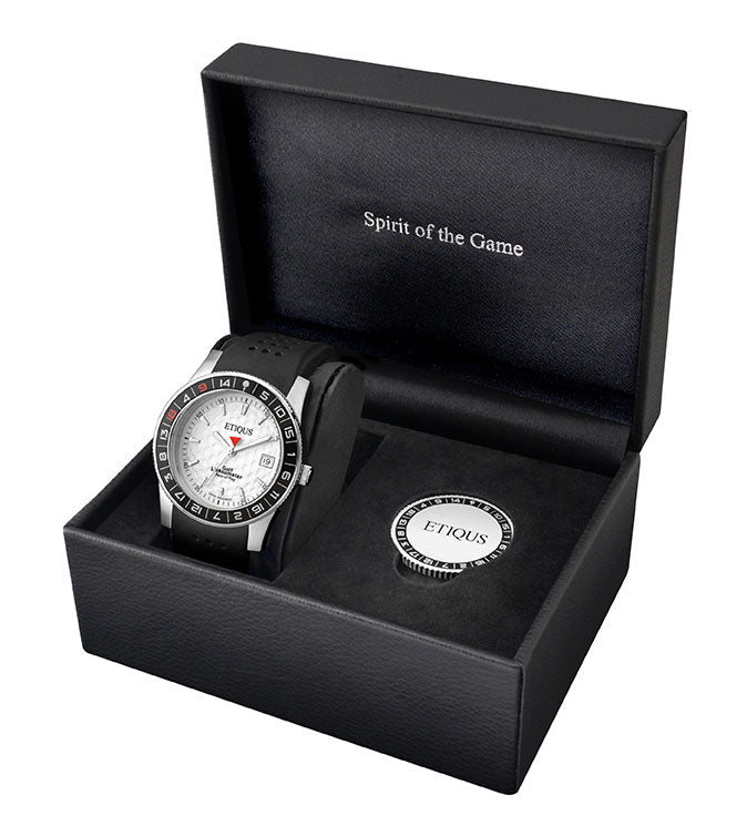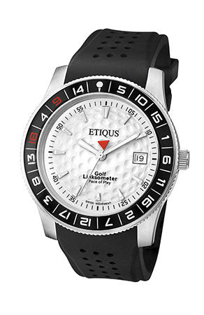 Patented Golf timepiece featuring high grade stainless steel case with sapphire crystal glass and black durable silicone strap. Dimpled dial with applied luminous inlaid hour markers. Swiss Quartz big date movement and rotating unidirectional bezel with Golf Linksometer markings. Presented in attractive gift box.