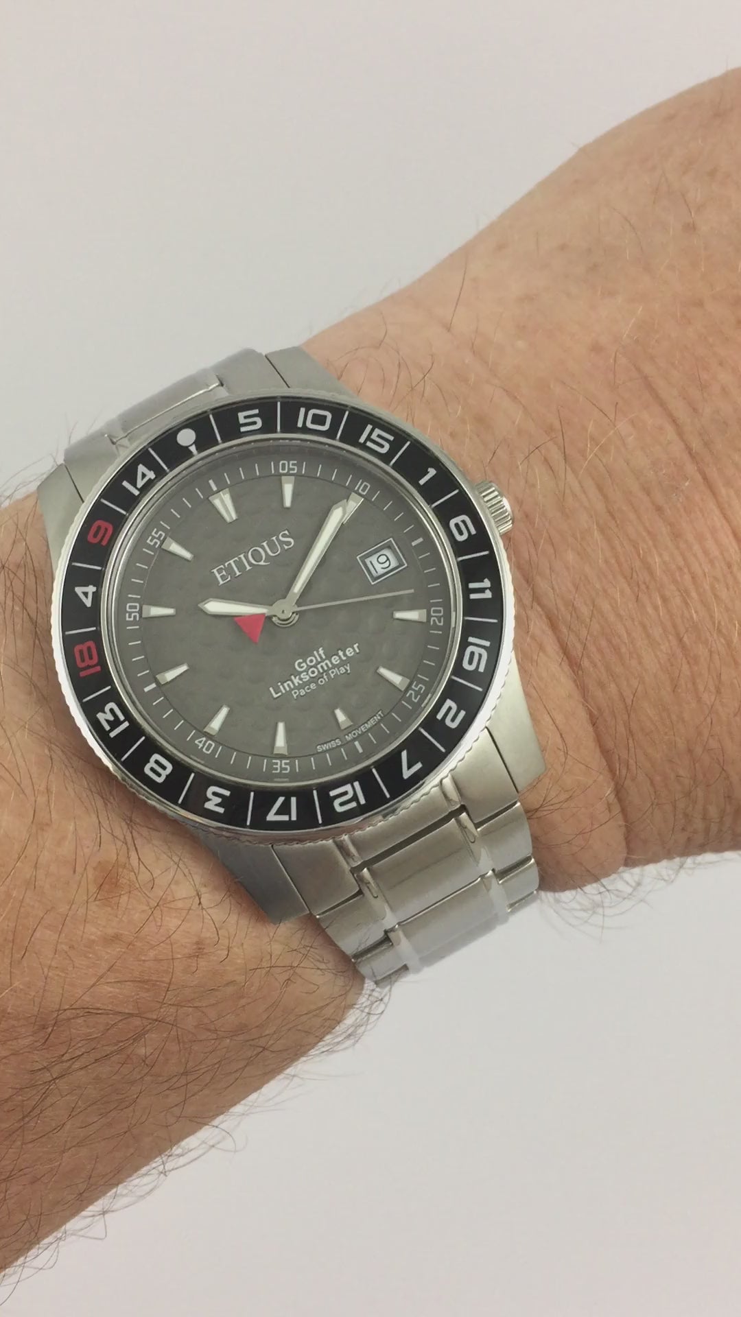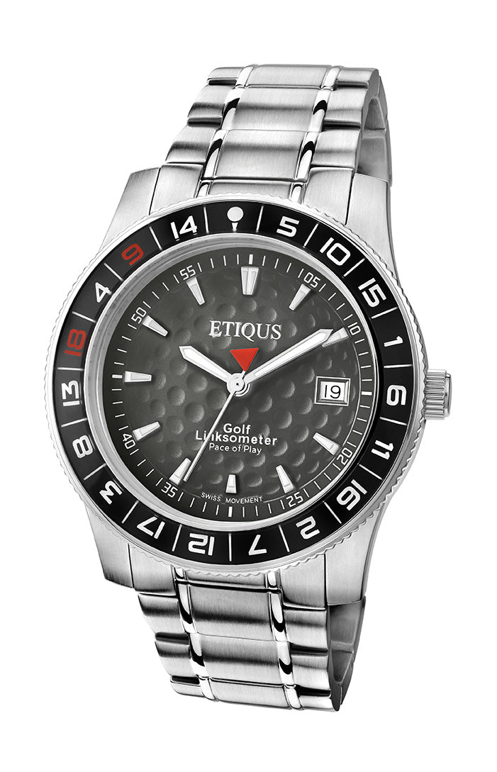 Patented Golf timepiece featuring high grade stainless steel case with sapphire crystal glass and solid stainless steel bracelet. Dimpled dial with applied luminous inlaid hour markers. Swiss Quartz big date movement and rotating unidirectional bezel with Golf Linksometer markings. Presented in attractive gift box.